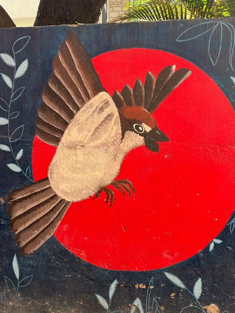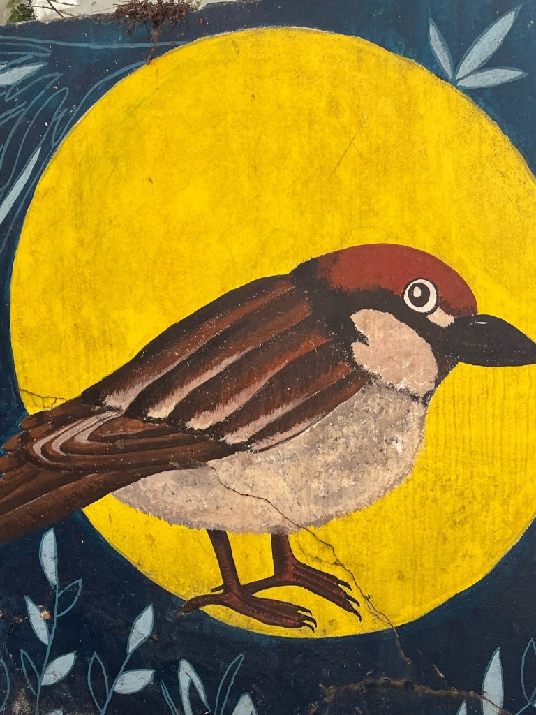 There used to be many sparrows in this area, but the numbers have reduced lately. These paintings from the street art endeavor to remember them.