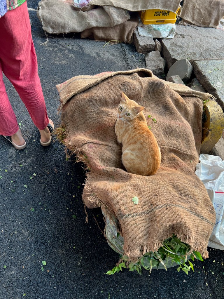I saw this cat with a woman at a market.