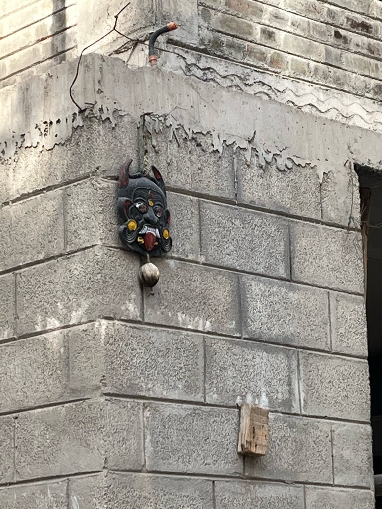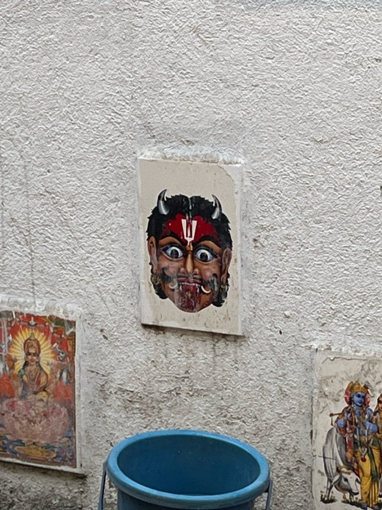 Our tour guide and the other young woman on our tour explained the belief and how it plays out in customs. If someone gets sick or has a piece of bad luck, some Hindu folks believe it is due to someone giving them The Evil Eye. It sounded to my novice ears like a curse. The Evil Eye works particularly well on people who are too perfect or beautiful. In order to ward off The Evil Eye, people will do things to make them, their loved ones, or their property less attractive. Examples given by the young women included: putting paint dots on babies’ forehead and cheeks, doing a burning around teenagers returning from a dance where they would have received praise (like a sage burning, not burning at the stake) or putting out the ugly mask on the outside of a home. Our tour guide opined that she didn’t like the custom because it felt like constant criticism. The other woman stated younger generations of Hindus tend not to believe in this teaching, but respect it for the sake of their grandparents.
