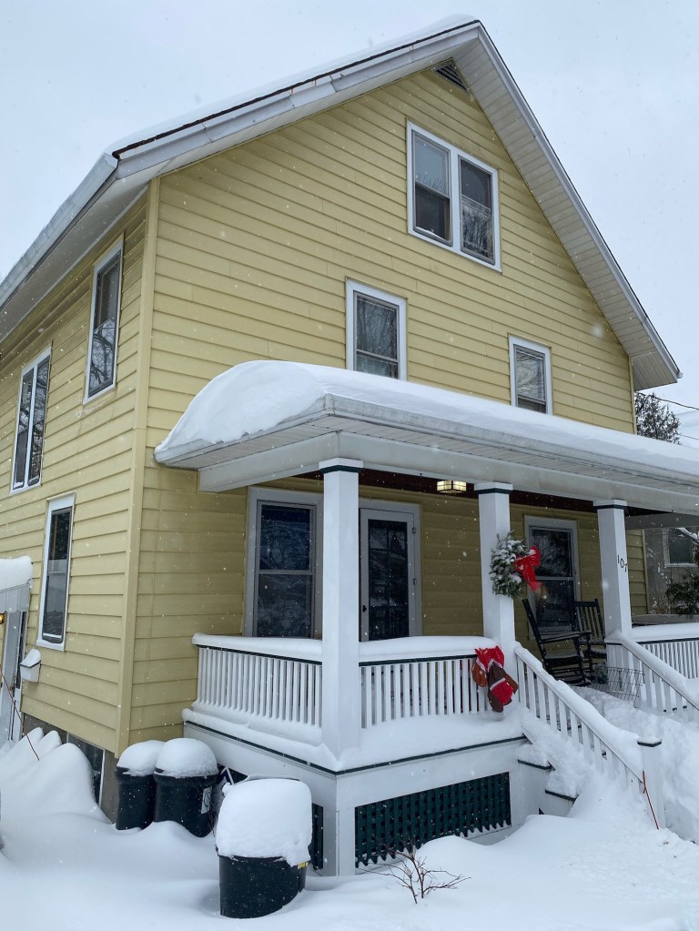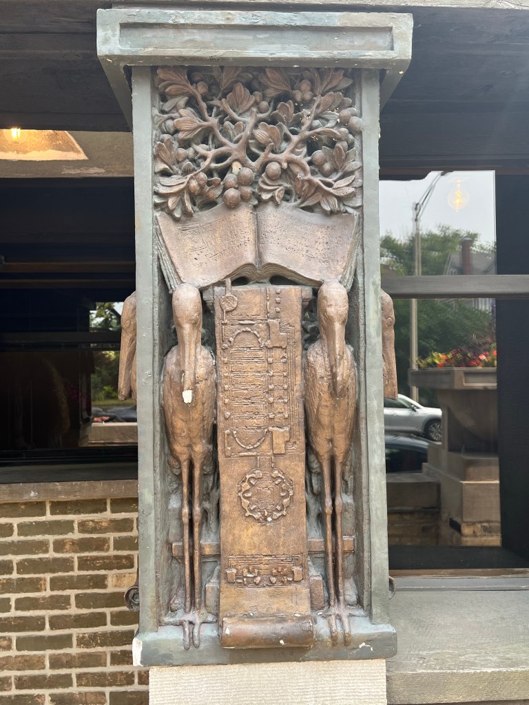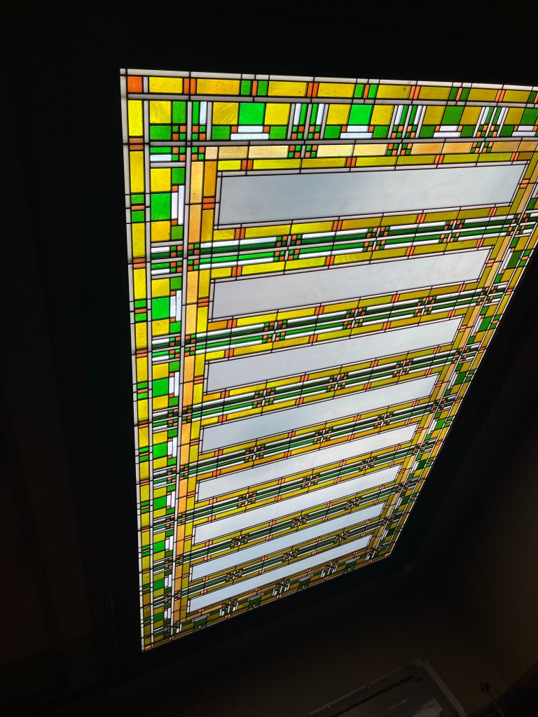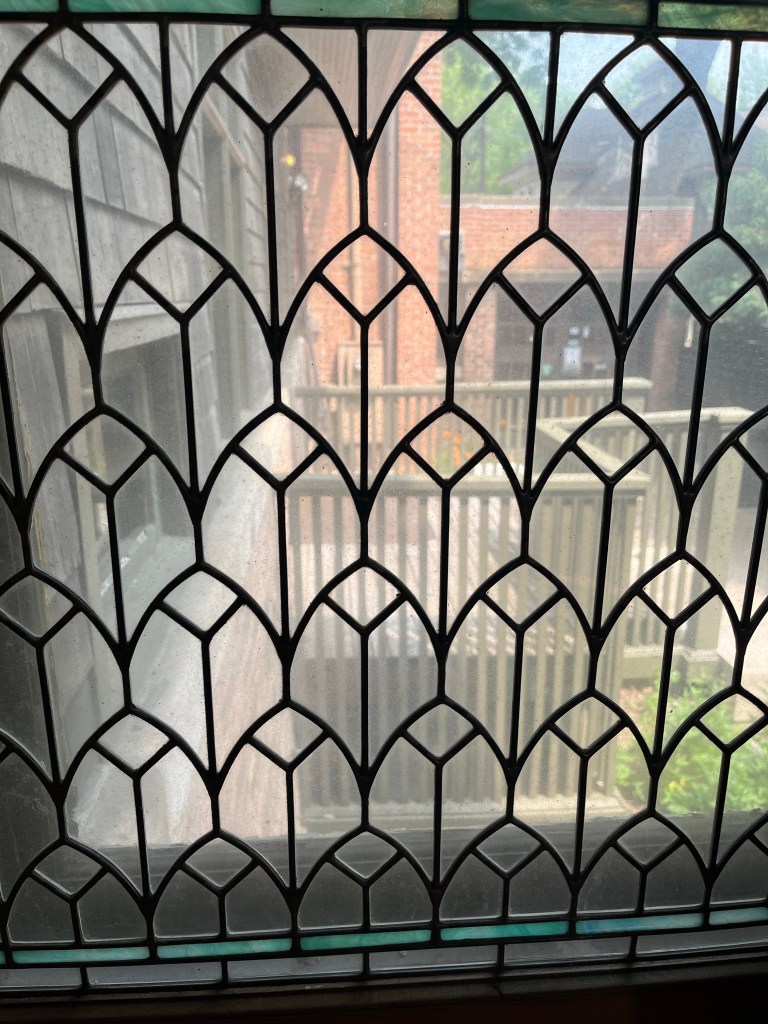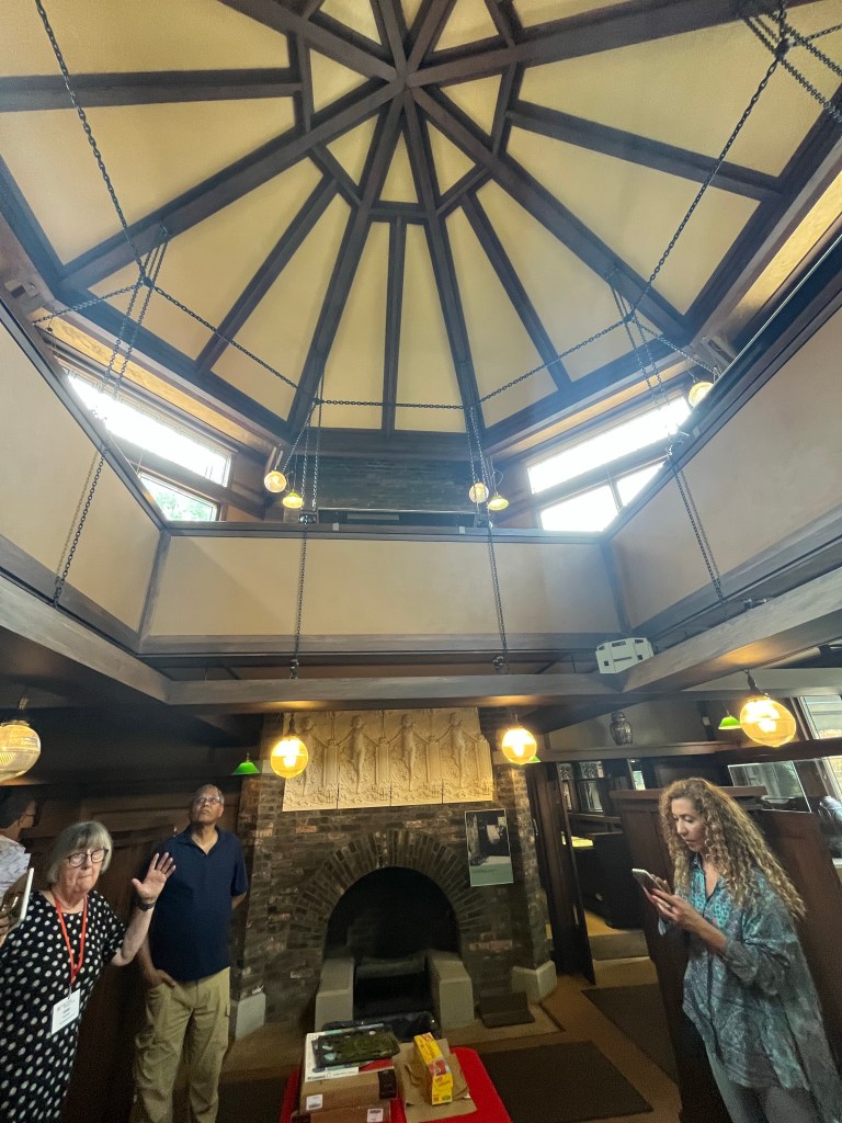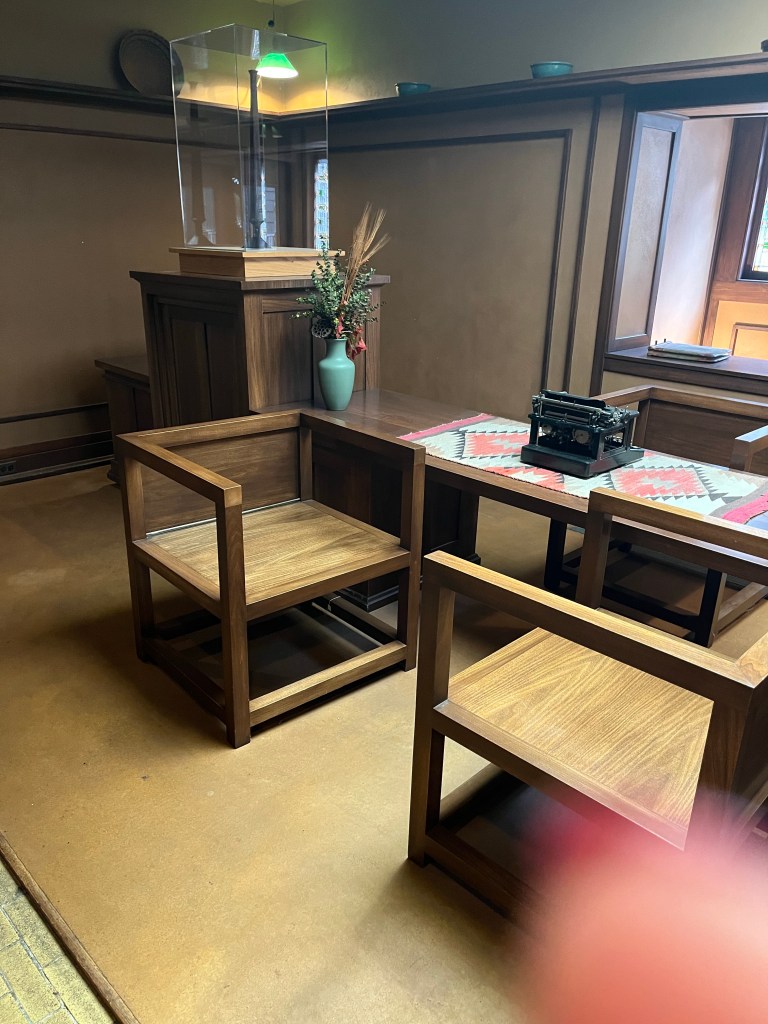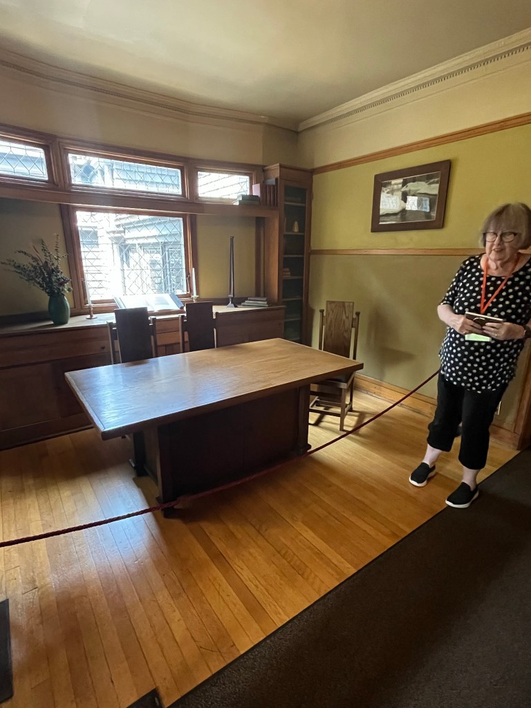 Wright is known for joining nature and buildings – in this house even working around a large tree branch- but more generally lots of big windows, stained glass and natural light, natural colors and wood in the decor, and creating open spaces in the rooms. Simple lines. Minimalistic. These things were in response to the elaborate, maybe gaudy style of the Victorian era. Interestingly, I have heard some of these things associated with Arts and Crafts homes — a style in my Ithaca neighborhood including our home, built in 1920 — but I need to research to understand the historical connections and influences. Which was the chicken and which was the egg?