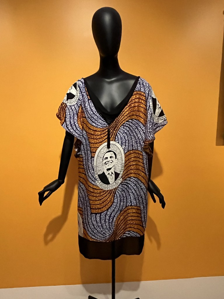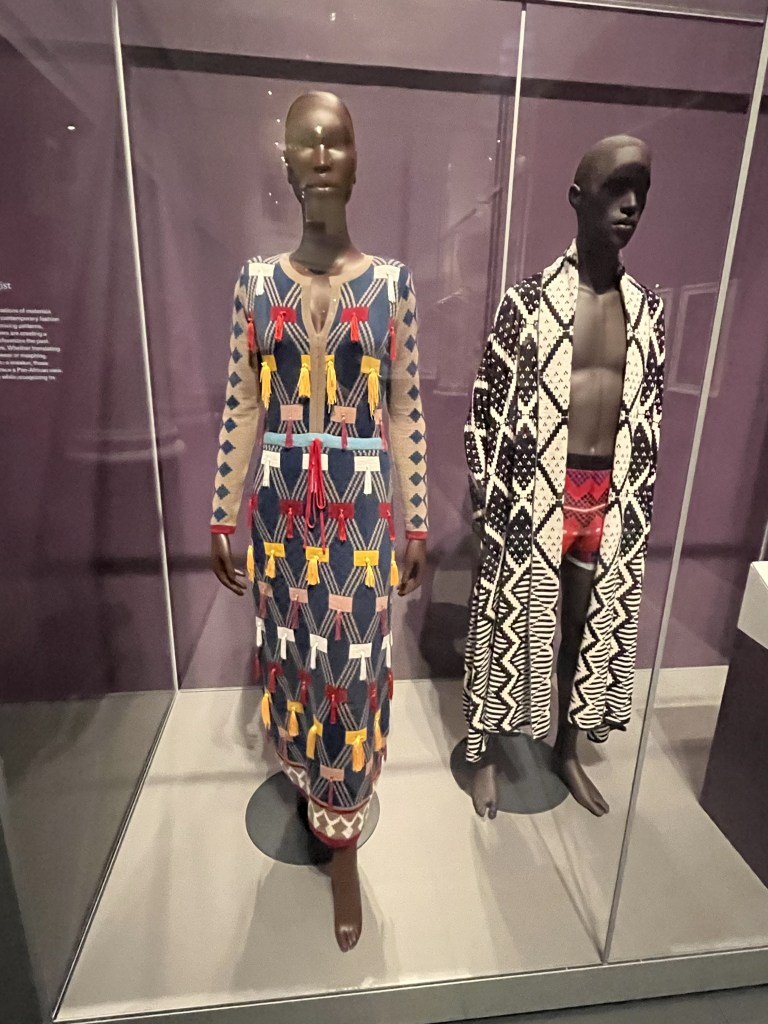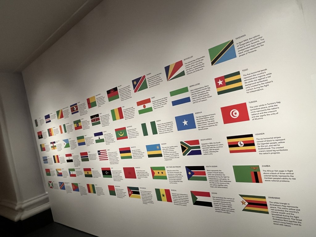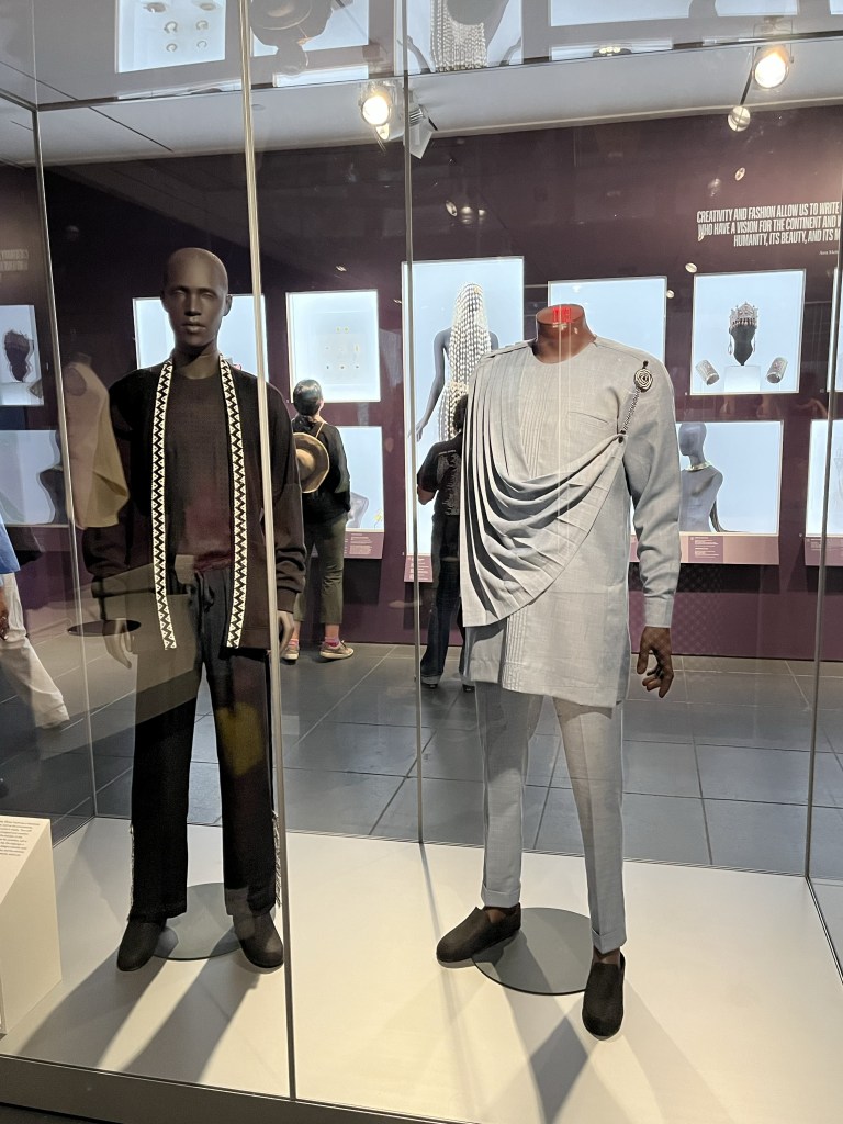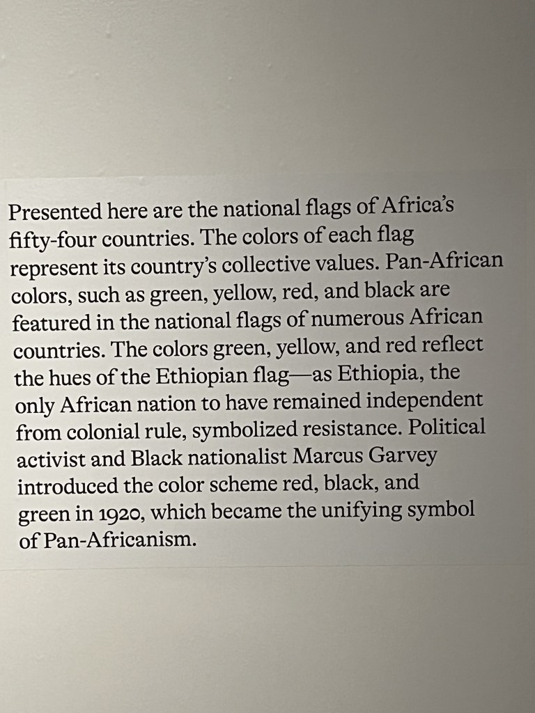I loved how the curator of this exhibit started this exhibit with information about colonialism. They noted which European countries colonized which sections/countries in Africa, and when freedom was achieved by each region. This impacts everything. According to one exhibit, cloth was introduced by the Europeans; Africans wove threads to make patterns uniquely their own.