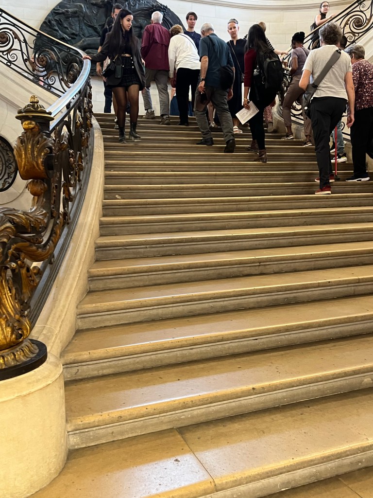 The Winged Victory was another beautiful Greek sculpture and I don’t remember a thing that Agathe said about it! From Wikipedia: The total height of the monument is 5.57 meters (18 ft, 3 in) including the socle; the statue alone measures 2.75 meters (9 ft). The sculpture is one of a small number of major Hellenistic statues surviving in the original, rather than Roman copies. Winged Victory has been exhibited at the Louvre Museum in Paris, at the top of the main staircase, since 1884.[3]
